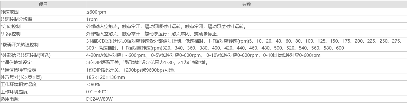 T600系列產(chǎn)品是主要針對(duì)配套客戶(hù)設(shè)計(jì)研發(fā)的蠕動(dòng)泵驅(qū)動(dòng)器,最高轉(zhuǎn)速為600rpm,轉(zhuǎn)速可調(diào)節(jié),適配多種泵頭,最大能提供2200mL/min的參考流量,可采用底板和面板兩種安裝方式,直流24V供電,體積小,結(jié)構(gòu)緊湊,適合配套使用。