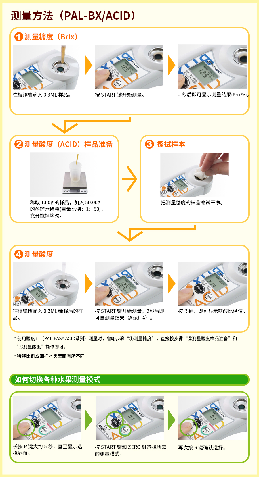 使用ATAGO(愛(ài)拓)糖酸度計(jì),糖度可直接取樣測(cè)量;酸度測(cè)量只需添加蒸餾水與測(cè)量樣品按重量比例(1:50)稀釋(即:果汁1ml,蒸餾水50ml)攪拌均勻后即可取樣測(cè)量。糖度及酸度測(cè)量完成后,按R鍵自動(dòng)顯示糖酸比。