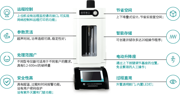 • 處理范圍廣 不同型號(hào)儀器可適用于不同客戶的需求,具有0.2-600ml的破碎量