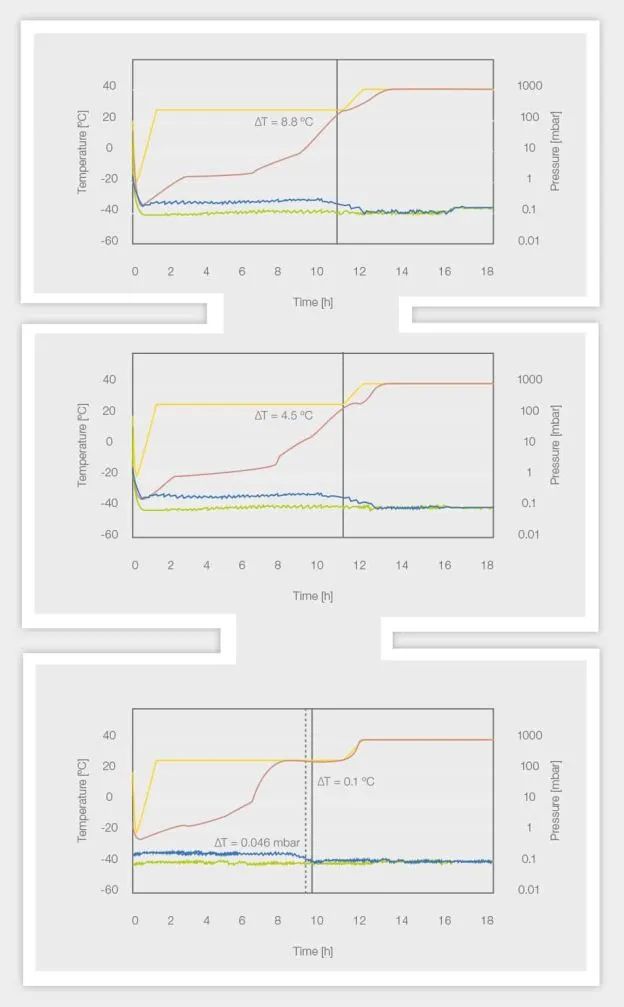 上圖所示為壓差為 0.05 mbar 的結(jié)果,中間圖為 0.03 mbar,底圖為 0.025 mbar 作為終點(diǎn)標(biāo)準(zhǔn)。在達(dá)到終點(diǎn)標(biāo)準(zhǔn)之前,壓差至少保持 60 分鐘。隔板溫度用黃線表示,樣品溫度用紅線表示,干燥箱壓力用綠線表示,皮拉尼壓力計(jì)在初級(jí)干燥(白色陰影)和二級(jí)干燥(灰色陰影)上用藍(lán)線表示。同時(shí)顯示達(dá)到壓力(黑線)和溫度終點(diǎn)標(biāo)準(zhǔn)(黑色虛線)的時(shí)間,以及該點(diǎn)相應(yīng)的溫度和壓力差。