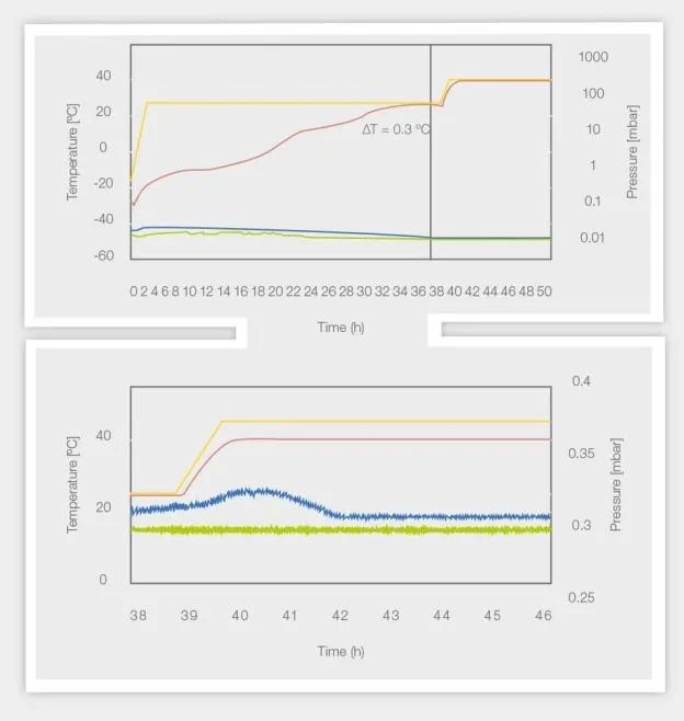 上圖顯示了整個(gè)凍干循環(huán),下圖顯示了二級(jí)干燥步驟的截取圖。隔板溫度用黃線表示,樣品溫度用紅線表示,干燥箱壓力用綠線表示,皮拉尼壓力計(jì)用藍(lán)線表示。圖中的白色陰影表示初級(jí)干燥,而灰色陰影表示二級(jí)干燥。同時(shí)還顯示了達(dá)到終點(diǎn)標(biāo)準(zhǔn)(黑線)的時(shí)間以及該點(diǎn)對(duì)應(yīng)的溫差。