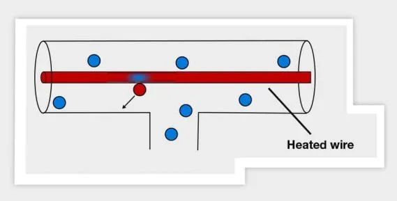該技術(shù)使用兩種不同的壓力計(jì),一個(gè)皮拉尼傳感器和一個(gè)電容壓力計(jì)。皮拉尼傳感器的工作原理是氣體的熱導(dǎo)率隨壓力變化。壓力計(jì)用一根細(xì)導(dǎo)線懸掛在氣體中,用電流加熱來(lái)測(cè)量壓力。在高壓下,由于周?chē)鷼怏w分子與金屬絲的高碰撞率,金屬絲將熱能損失給氣體。這一原理如下圖所示。