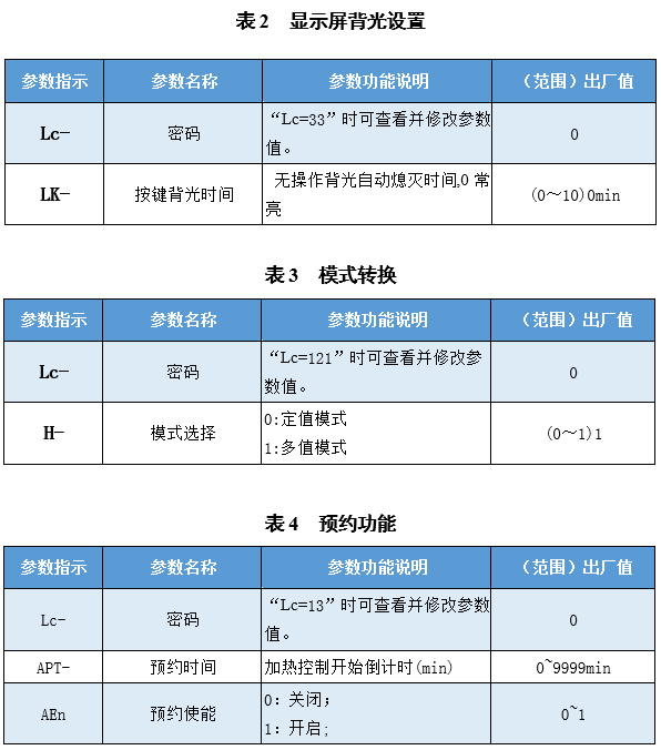 長按設(shè)定鍵約3秒,控制器顯示窗下排顯示密碼提示符“Lc”,上排顯示密碼值,通過增加、減少和移位鍵,修改到所需的密碼值。