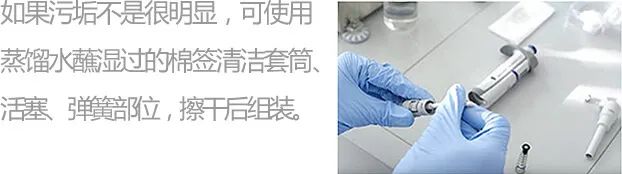 > 先將移液器下半支拆卸,用干凈的紗布或無塵紙將活塞上原有的潤滑油抹去