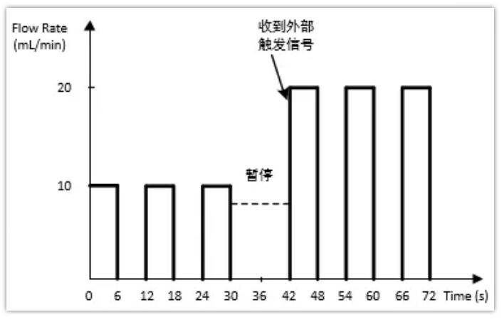 方案內容:以10mL/min的流量灌裝6秒(灌裝量為1mL),灌裝3次(間隔6秒),暫停;待收到外部觸發(fā)信號后,以20mL/min的流量灌裝6秒(灌裝量為2mL),灌裝3次(間隔6秒),停止。