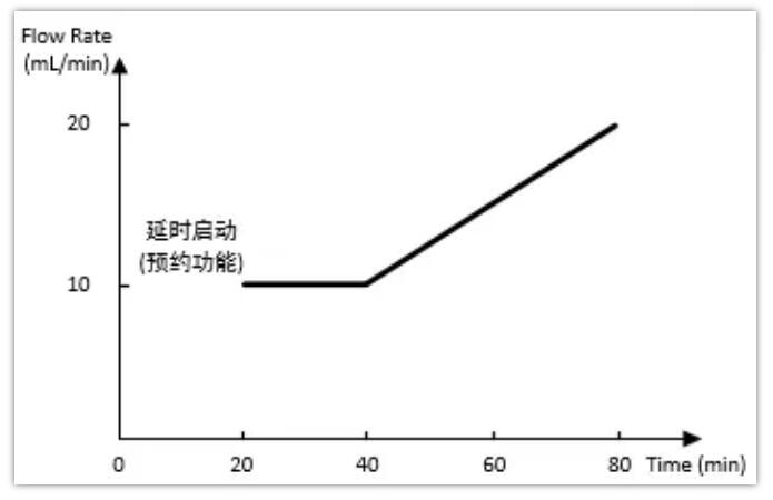 方案內容:延時20分鐘啟動泵,以10mL/min流量運行20分鐘,之后流量線性遞增,在40分鐘內流量從10mL/min遞增至20mL/min。