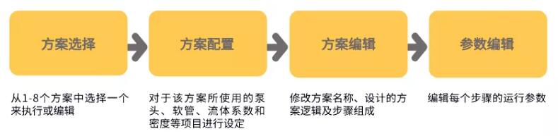 在方案參數編輯界面可以對方案名稱進行建立和修改,也可編程方案的構架(增加或刪除步驟),還可以對設定的步驟進行使能選擇。