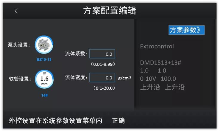 在方案配置界面中可以選擇泵頭、軟管以及確定流體系數和流體密度。
