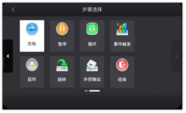 而邏輯步驟一共有八個,包括:方向、暫停、循環(huán)、事件觸發(fā)、延時、跳轉、外控輸出和結束。
