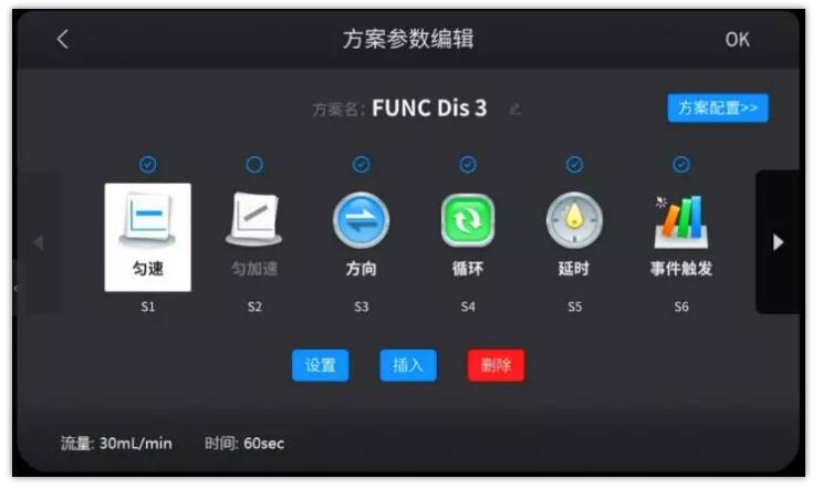 方案步驟的使能指的是如上圖所示,在一個已經編輯好的方案中,若不想執(zhí)行第S2步驟“勻加速”的內容,可以選中該步驟后,點擊屏幕中下方的“刪除”按鈕將其刪除。也可以直接點擊該步驟圖標上方的使能圖標“ 帶√的藍色小圈”取消該步驟,取消后使能圖標將變成“無√ ”的狀態(tài),同時步驟圖標也變?yōu)榛疑?/p>